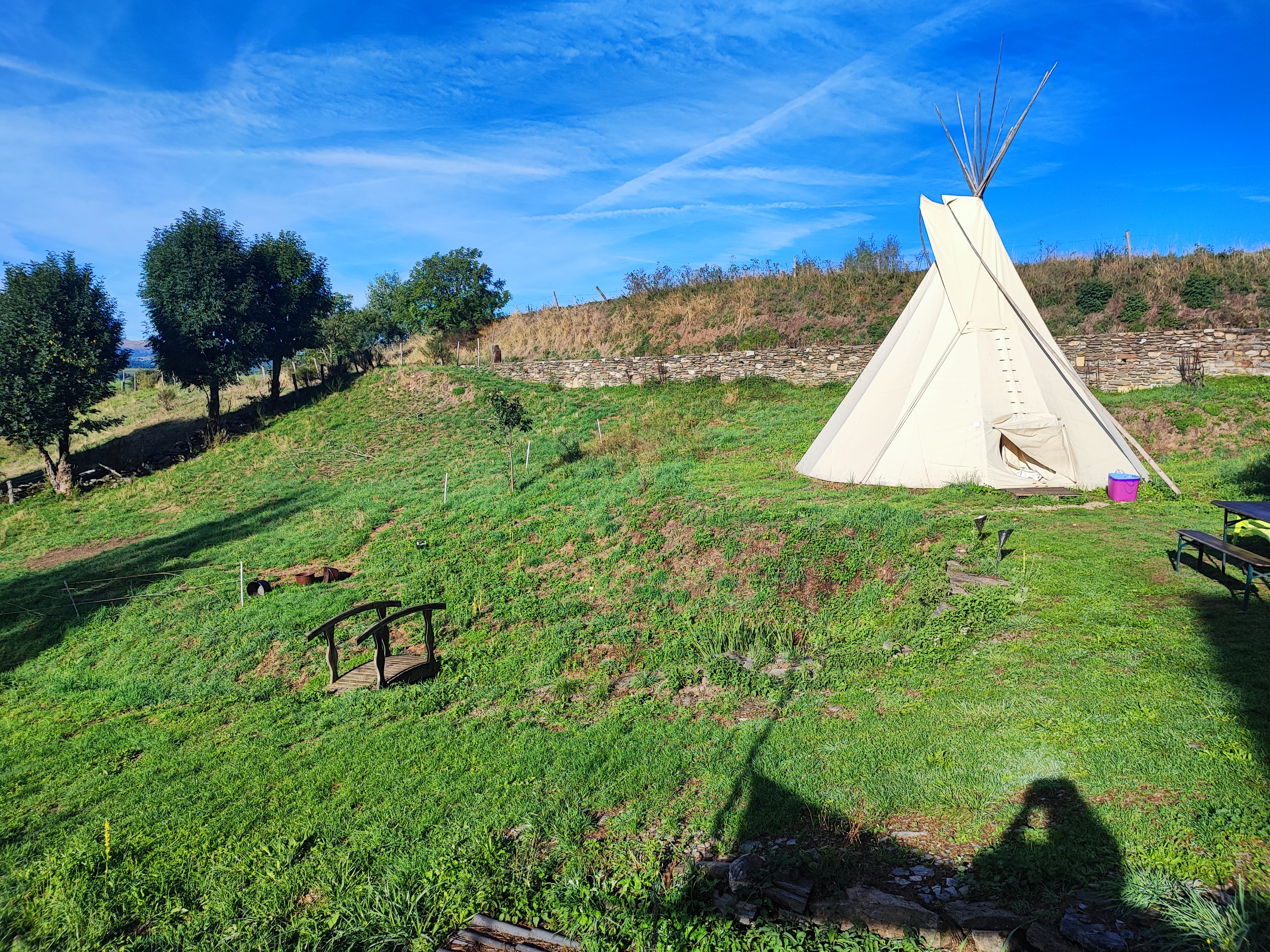 2 tipis, un gîte d'étape. Les gens qui vous reçoivent sont très gentils. Tout le monde peut manger ensemble ou pas. Ambiance de partage ou vous pouvez faire le sauvage aussi. Sanitaires nickels. Le gîte est partagé selon les jours et vous permet d'avoir accès à la cuisine, prise de courant...